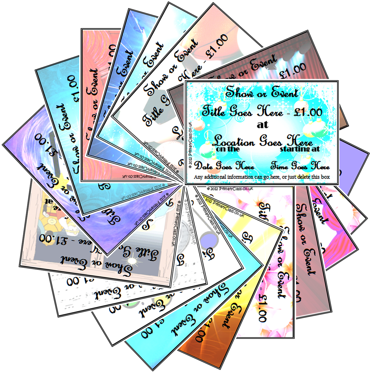 The editable tickets on this page are free for you to download and print for your school. There are 8 tickets per A4 sheet. Text and font are editable and there is space for event name, location, date, time and additional information. There are 17 different types and all require word.